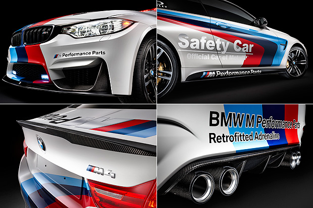 M4 Safety Car以先前在底特律車展中正式現身的M4 Coupe為基礎,維持著與量販車款相同的外形輪廓,不過換裝了M款黑色水箱護罩,前氣壩的空力套件、車尾分流器與行李廂蓋上的鴨尾導流以及後視鏡外殼,也全數換上碳纖維套件。同時,引擎蓋也換裝賽車用快拆固定座,搭配車內的Recaro賽車座椅與防滾籠,帶來更具賽車氣息的視覺效果。