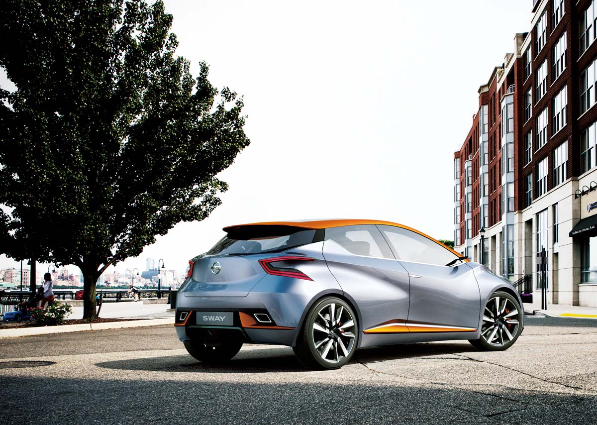 Nissan在日內瓦車展上發表的Sway概念車,原廠所提供的尺碼為長4010、寬1780、高1385mm,軸距2570mm,這部小型五門掀背車的格局讓人聯想到接下來Nissan March的改款趨勢,車身造型從車頭V字形水箱罩和鈑件曲線等皆具備Nissan家族現有的設計元素,全車更額外流露著動感、銳利且熱情的歐系都會小車時尚風貌,讓人期待不久的將來融入到量產車款所將呈現的綺麗風光。