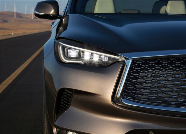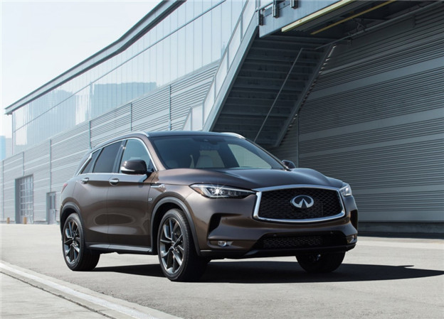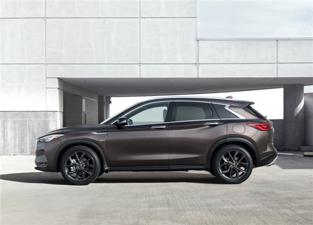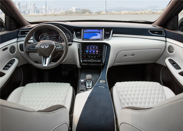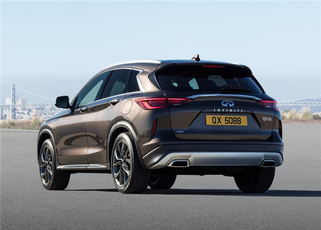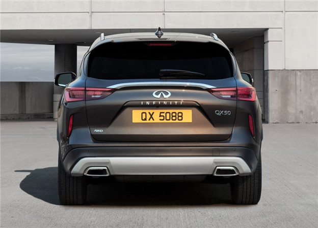 量產版 QX50 的外觀與先前各大登場的概念車十分相近,除了頭尾照明燈組沒有那般前衛之外,招牌的雙弓形水箱護罩、Powerful Elegance 設計語彙帶來肌理感線條皆如出一徹,展現出 Infiniti 新世代家族化面孔。另外全車多處像是水箱罩、弓形窗框以及雙邊單出矩形排氣管等部件,還用上鍍鉻飾條妝點出豪華質感,而 4,693x1,903x1679mm 的車身尺碼比前代車型略短,但寬度/高度略微增加則確保車室空間,軸距則為 2,800mm
