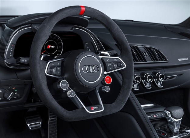 Performance Part R8的內裝也經過一番調整,除了既有的環艙碳纖維飾板之外,方向盤也換成全麂皮Alcantara材質設計並在12點鐘的位置設有紅圈的定位點,後方換檔撥片也是正碳纖,宛若性能之殿的華麗武裝。
