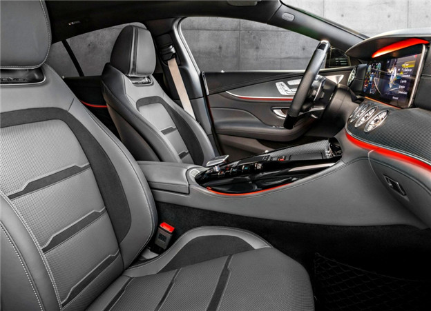 內裝配置也維持既有架構,有著 AMG GT 精隨的高聳中央鞍座,以「V8」將按鈕介面排列,創造專屬於 GT 4-Door 的性能印象,不過在 GT53、GT63 提供五座、獨立四座兩種設定的情況下,原廠並未表示定位為入門車型的 GT43 是否也能夠擁有此一選配。