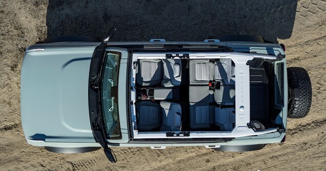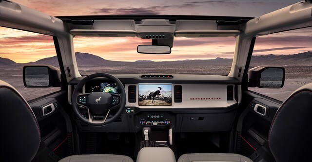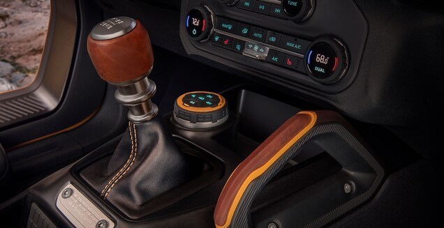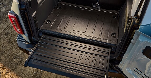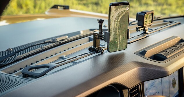 現在很多越野車都宣傳自己車箱內部可以直接用水衝地板,Bronco也不例外,橡膠地板上也有放水孔,據說座椅還採用了防止發霉的乙烯材料,車內按鍵旋鈕也能放泥沙,這有點意思。而且中控台上還帶有多功能拓展架,什麼手機支架、Go Pro都可以往上裝。