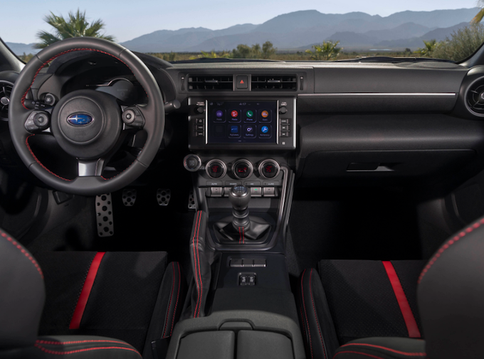 內飾方面,新車並沒有採用時下流行的誇張奪目的液晶屏幕,也沒有營造豪華的氛圍,這麼多年過去了還是採用中規中矩的設計,新BRZ8英吋中控屏搭載了斯巴魯最新的Starlink系統,並且支持Apple CarPlay以及Android Auto。可能是整車的開發都是圍繞著「駕駛」,譬如簡潔的設計減少材質的運用從而減輕重量;7英吋液晶儀錶盤可顯示專業的車輛信息,在進入賽道模式後變得更為更激情。就如同年輕人一樣熱血、純粹。