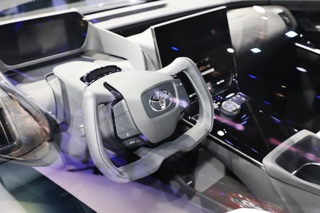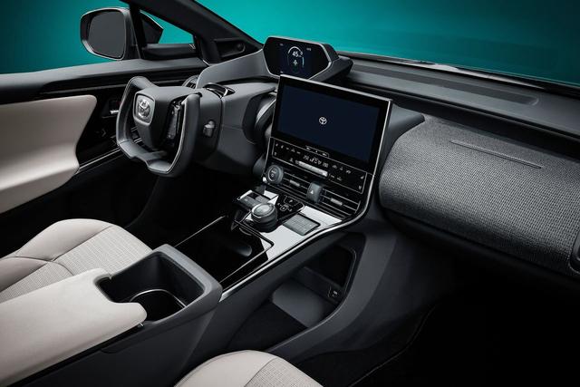 來到車內,新車採用了非常簡約的設計,中控台區域被一塊尺寸碩大的懸浮屏佔據了視覺重心。bZ4X採用了類似新款特斯拉Model S的異形方向盤,但這樣的設計量產可能性不大。方向盤前方設計了全液晶儀表,位置安放的比較靠上。值得一提的是,新車使用了全新開發的線控轉向技術