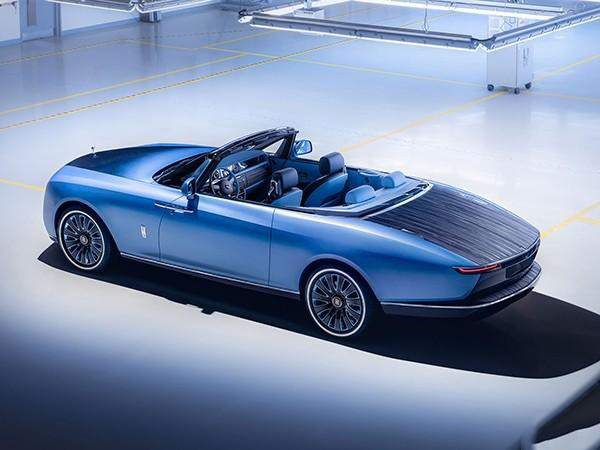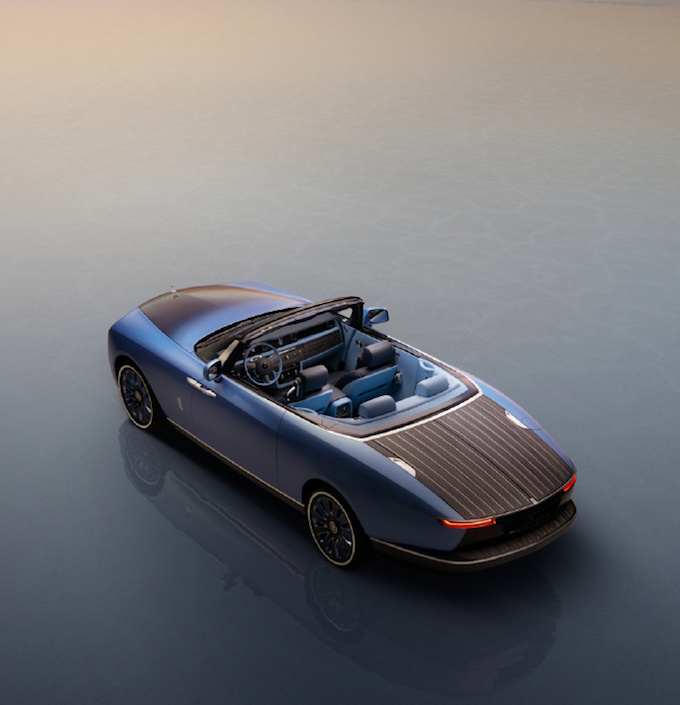 鬼面罩依然採用勞斯萊斯經典的「帕特農神廟」設計,但頭燈更加扁平和細長的尾燈相互輝映。車尾展示了最好的手工設計和尖端的工程技術。因為在傳統後備廂的位置,勞斯萊斯為其定制了類似於遊艇甲板般的待客區。「甲板」由灰黑色開孔Caleidolengo飾板製成,中間還設計了一把可折疊的專屬太陽傘,甚至在「甲板」下層還準備了兩張由勞斯萊斯設計、意大利傢具品牌Promemoria精心打造的雞尾酒凳。在內部,則是為用打造的一整套戶外用餐的餐具,以及可以在6攝氏度下快速冷藏的香檳冰箱。