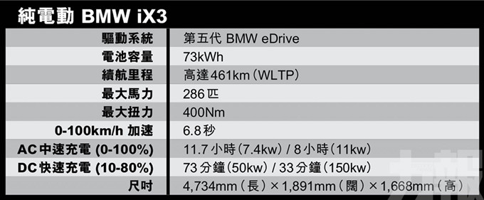 iX3使用第五代eDrive電動驅動系統技術,將強大的電動摩打、傳動系統、電子裝備等整合在鋁合金車架內,大幅節省空間及輕量化車重,提供極致的高效省電表現。擁有後驅馬達輸出286HP,0至100公里加速只需6.8秒 。容量為73.83kwh的高壓電池組,綜合電耗18.9至18.5 kWh/100 km,憑着高效的動能回收系統,續航里程達460公里,最高可支援150KW直流電快充,充電10分鐘可行駛100公里。BMW iX3長達8年/16萬公里的高壓電池原廠保用。