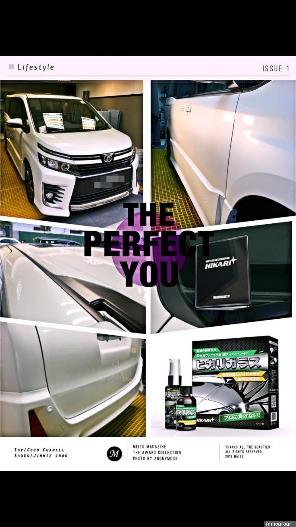 TOYOTA VOXY完成為持9個月的鍍膜Glass coating(for 9 month) , 產品介紹 coat內含專利配方的氟素樹脂,氟素具有極低的摩擦系數,這種光滑的特性,不僅灰塵不易沾附,而且有撥水、撥油的功能,專利配方的氟素樹脂,使用後在車漆表面形成一層強韌的撥水保護膜,將車漆和外界完全隔離起來,因此可以維持車漆長期的乾淨明亮。