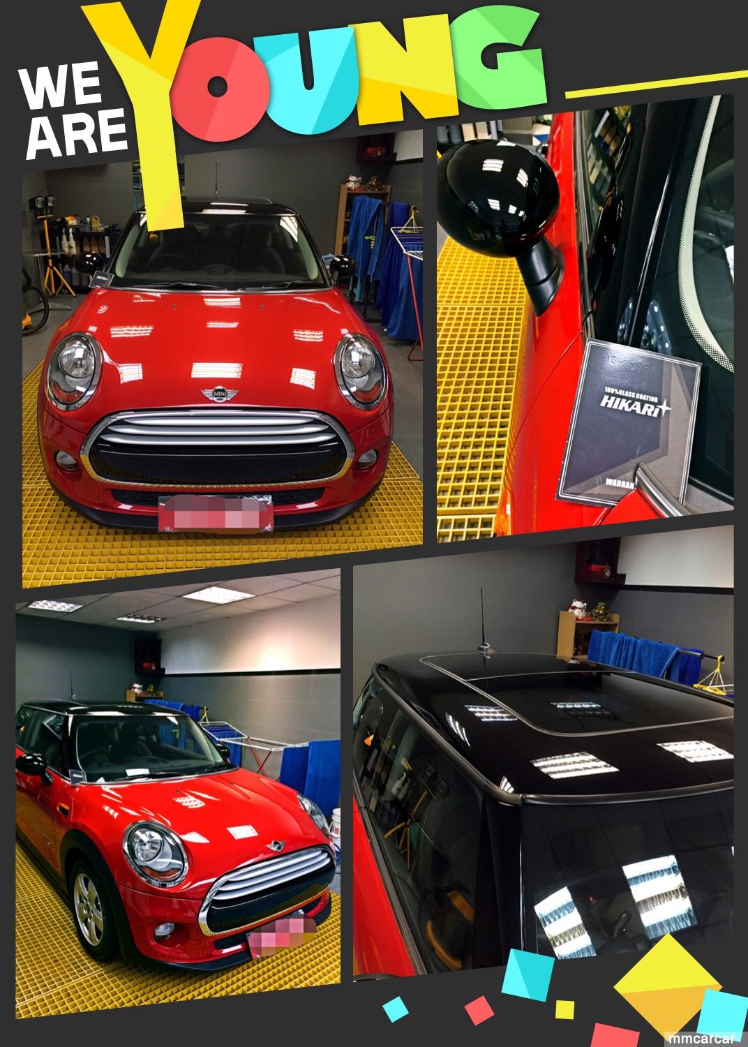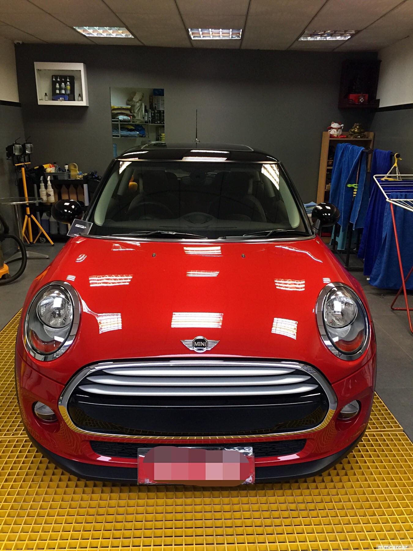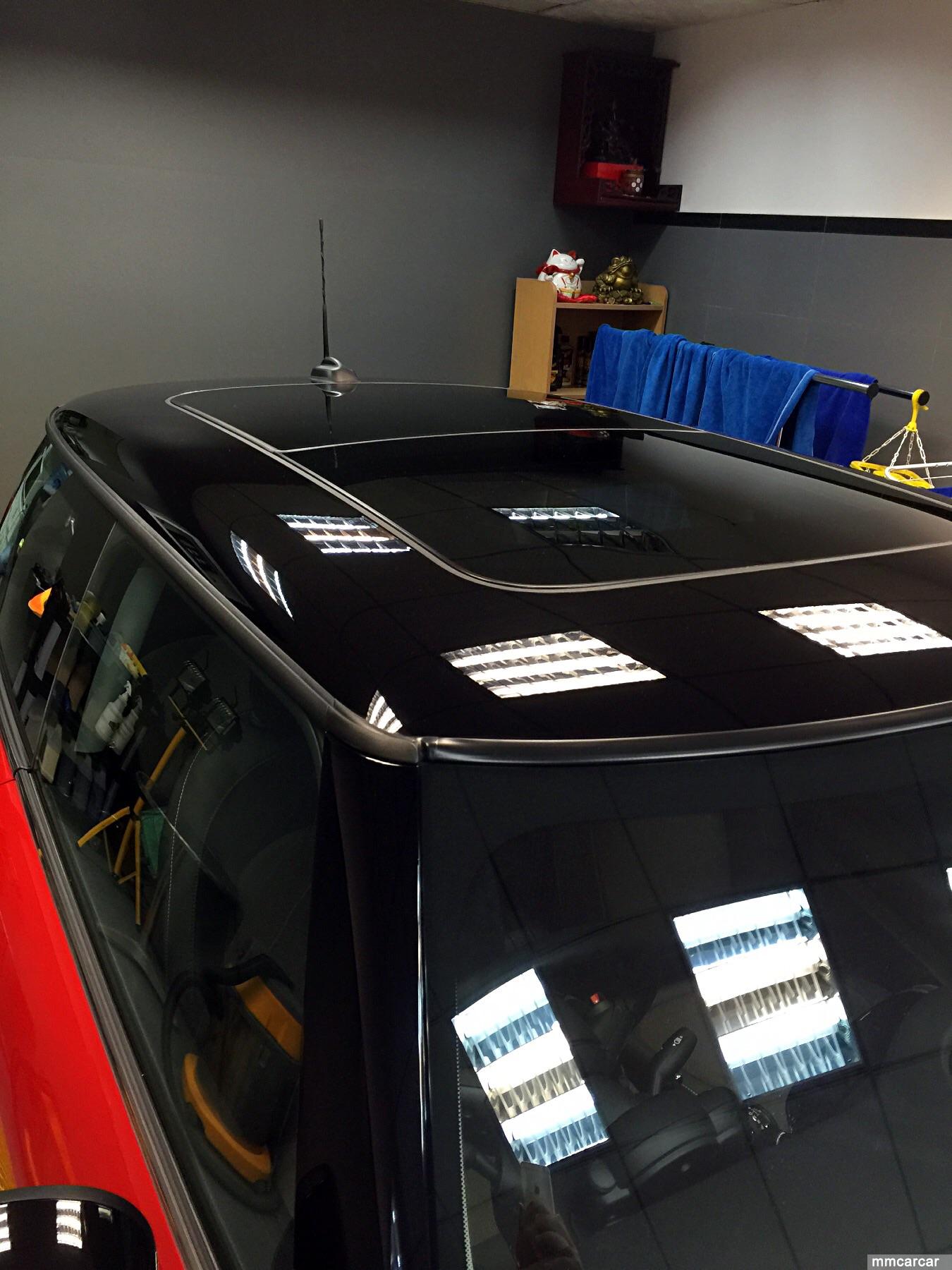 新款Mini Cooper內籠設計一流,外殻無物大轉變。紅色車身黑色頂,車身只作一般處理後就可以做Sio2 35% coating (for 12 month) 但是車頂,兩旁側鏡及A,C柱位黑色部分有D難道,幼紋好多又吾可以用中粗臘去花痕,只有慢慢一少部份作重點處理,精細研磨各部份就用了2小時.