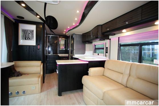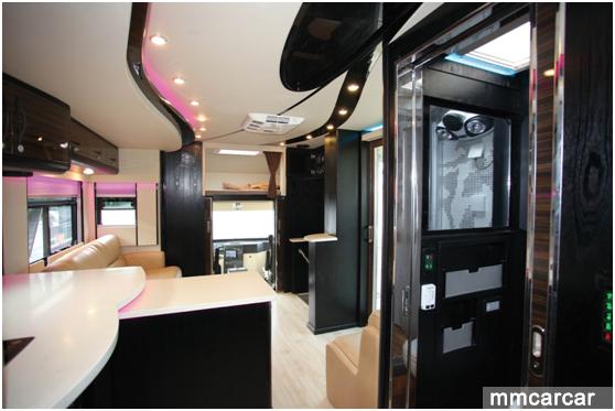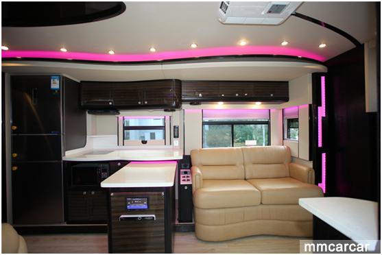 该款房车结合了旅游、家居的用途。整车分为驾驶区、会客区、厨卫区、休息区,既可以居家旅游,也可以商务接待,娱乐设施、影音系统一应俱全,配套精心制作的内饰,俨然一个移动的五星级酒店。